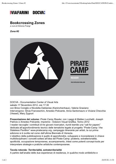 l reader raccoglie i contributi di tre giovani ricercatori, riuniti tramite una “call for papers” dedicata all’approfondimento teorico delle tematiche legate al progetto “Pirate-Camp / the Stateless Pavillion” www.piratecamp.org, campeggio itinerante per artisti, la cui prima edizione si è svolta nel corso dell’ultima Biennale di Venezia.