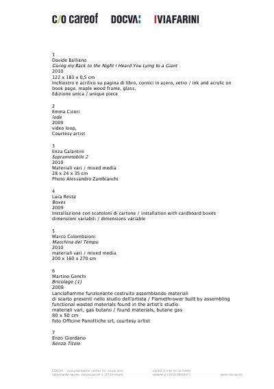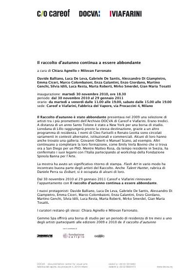 Il Raccolto d’autunno è stato abbondante presentava nel 2009 una selezione di artisti tra i più promettenti dell’Archivio DOCVA di Careof e Viafarini. Erano tredici. A distanza di un anno Santo Tolone è stato a New York per una borsa di studio. Loredana di Lillo raggiungerà presto la stessa destinazione, grazie a un altro programma di residenza. I nomi di Cleo Fariselli e Renato Leotta sono circolati variamenti in contesti alternativi, istituzionali e commerciali. Alcuni di loro hanno anche trovato una galleria: Giovanni Oberti e Manuel Scano, ad esempio. Altri continuano a completare la loro formazione, come Emily Verla Bovino che si trova ora a San Diego per un PhD. Mentre Matteo Rosa, da tempo residente in Svezia, ha confermato i suoi legami con l’Italia partecipando al workshop della Fondazione Spinola Banna per l’Arte.