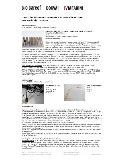 Dal 30 novembre 2010 al 29 gennaio 2011 Careof e Viafarini rinnovano l’appuntamento con Il raccolto d’autunno continua a essere abbondante.