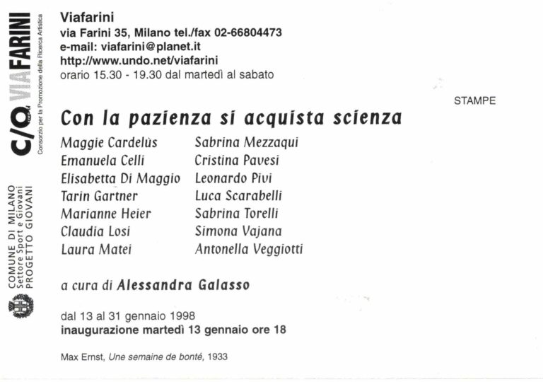 Artisti: Maggie Cardelùs, Emanuela Celli, Elisabetta Di Maggio, Tarin Gartner, Marianne Heier, Claudia Losi, Laura Matei, Sabrina Mezzaqui, Cristina Pavesi, Leonardo Pivi, Luca Scarabelli, Sabrina Torelli, Simona Vajana, Antonella Veggiotti
