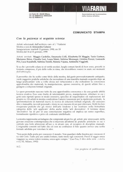 Il proverbio che ho scelto come titolo della mostra, dal gusto provocatoriamente antiquato, vuole suggerire pratiche artistiche che necessitano di una maestrìa manuale acquisita dopo un lungo 'praticantato' (che a volte sfocia nel virtuosismo) e che richiedono la conoscenza approfondita dei materiali, la manipolazione, spesso ossessiva, di questi ultimi fino a giungere a soluzioni formali originali.