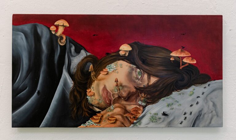 Nei dipinti di Irene Vescovo, questioni esistenziali diventano lo spunto per efficaci rappresentazioni figurative che esplorano il sottile confine tra realismo e onirismo. Come in un sogno a occhi aperti, scenari ipotetici accolgono autoritratti che funzionano come figure simboliche.
