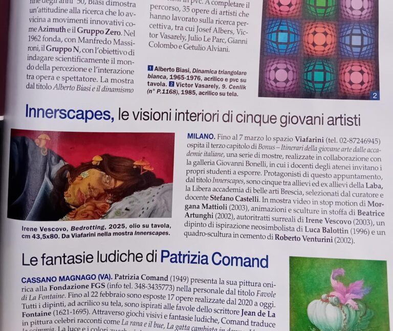 VIAFARINI è lieta di presentare Innerscapes, terza mostra del ciclo BONUS – Itinerari della giovane arte dalle Accademie italiane, ideato in collaborazione con la Galleria Giovanni Bonelli. In ogni “episodio” di questo ciclo, docenti di diverse accademie italiane sono invitati a selezionare uno o più studenti emergenti: il progetto intende così riportare al centro del dibattito la formazione artistica in Italia e dare visibilità ai giovani che muovono i primi passi della loro ricerca.
