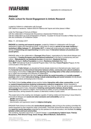 ENGAGE prende la forma della Public School, modello già sperimentato a livello internazionale, basato sull'interazione orizzontale e non gerarchica tra artista, mediatore culturale e comunità.
